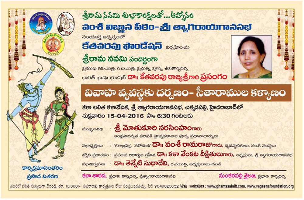 వంశీ విజ్ఞాన పీఠం శ్రీ త్యాగరాయగానసభ సంయుక్త ఆధ్వర్యంలో కేతవరపు ఫౌండేషన్ నిర్వహించిన శ్రీ రామ నవమి సందర్బంగా ప్రముక కవయిత్రి, రచయిత్రి, ప్రభుత్వ పూర్వ ఉపకార్యధర్శి భారత్ భాషా భూషణ్ డా||కేతవరపు రాజ్యశ్రీ గారి ప్రసంగం . తేది: శుక్రవారం 15-04-2016 సా: 6:30 గంటలకు.